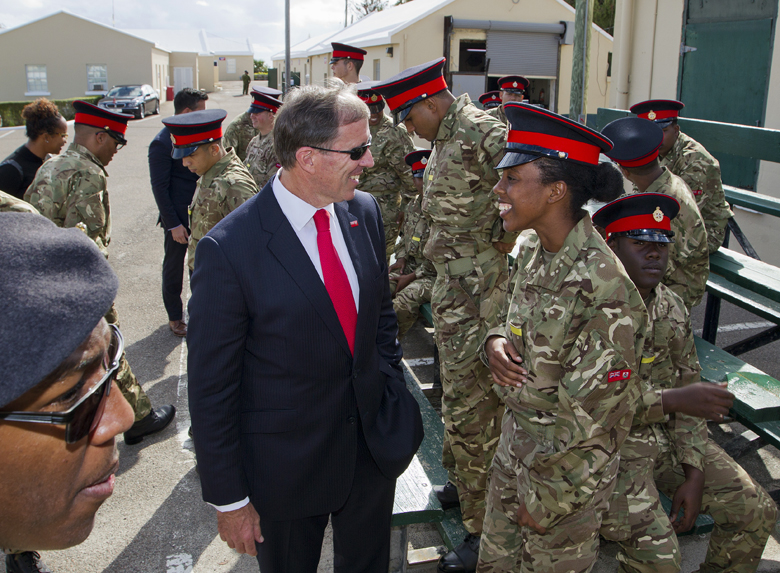 This morning, Premier, The Hon. Michael H. Dunkley, JP, MP, Minister of National Security, Senator the Hon. Jeffery Baron, JP and Junior Minister of Social Development and Sports Nandi Outerbridge, JP,MP visited the 60 volunteer recruits in the Royal Bermuda Regiment at Warwick Camp.