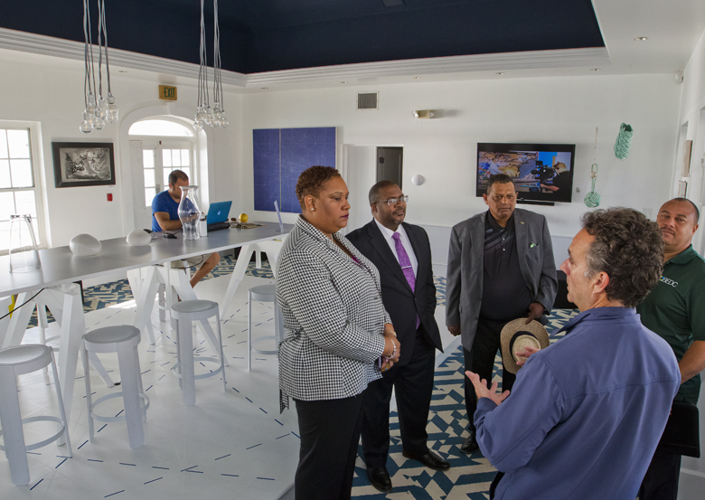Joined by BEDC’s Ray Lambert, the group spoke with St. George’s Crown Creative Director, Jarae Thompson about his new St. George’s Community Newspaper, and Mark Soares, Bermuda Yacht Services, shared stories about the impact of visiting yachts to the St George business community.